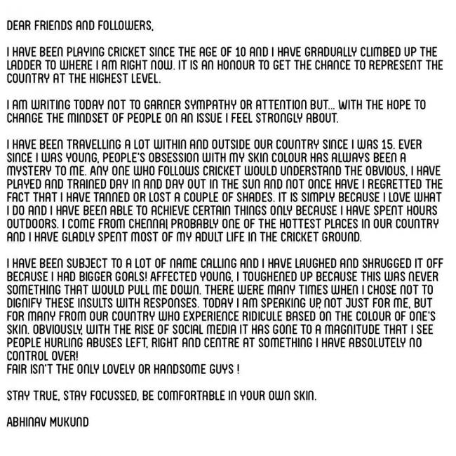 Mukund, who is an opening batsman for India, issued a statement on Twitter speaking against the kind of comments he face for his skin color. However, he said the statement is meant for the bigger mass.