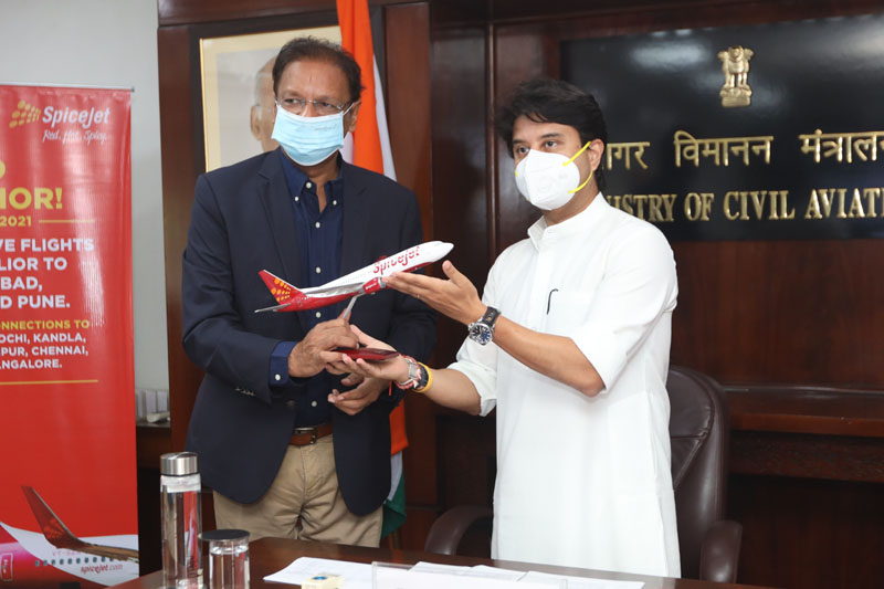 Jyotiraditya M. Scindia, Hon’ble Union Minister of Civil Aviation, flagged off the inaugural SpiceJet flight from Gwalior to Pune virtually in the presence of Shivraj Singh Chouhan,Chief Minister of Madhya Pradesh, Narendra Singh Tomar Union Minister of Agriculture & Farmers' Welfare, Rakesh Singh, Hon’ble MP, Jabalpur, Vivek Narayan Shejwalkar, MP, Gwalior, Kirit Premjibhai Solanki MP, Ahmedabad West, Pradhuman Singh Tomar, Minister of Energy, Govt. of Madhya Pradesh, Pradeep Singh Kharola, Secretary, Ministry of Civil Aviation and Ajay Singh, Chairman and Managing Director, SpiceJet.