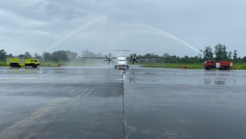 The ATR-72 type aircraft by M/s. FlyBig airline was greeted with the traditional water canon salute by the Tezu Airport fire team. This flight will operate on Guwahati- Tezu- Guwahati route on every Tuesday, Thursday, Saturday and Sunday.