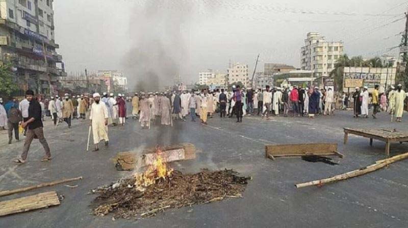 Students of Narayanganj Madaninagar Madrasa set fire and set up barricades on the Dhaka-Chittagong highway.