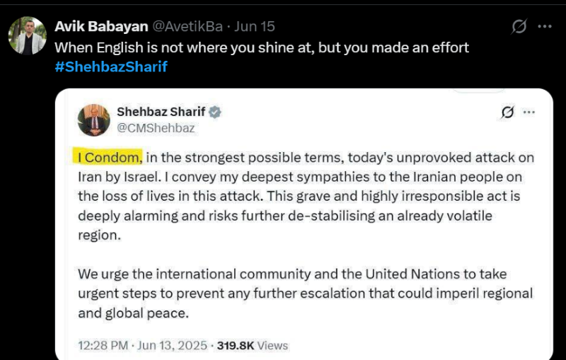 Pakistan's Prime Minister mistakenly wrote 'condom' instead of 'condemn' in the support of Iran.