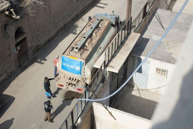 On 4 January 2017, children at Ibn Hazm School in Syria's capital Damascus have water for the first time in almost two weeks, after UNICEF started emergency trucking to 50 schools in the area.