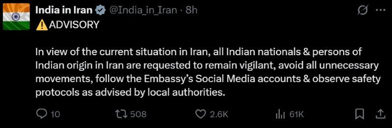 "In view of the current situation in Iran, all Indian nationals & persons of Indian origin in Iran are requested to remain vigilant, avoid all unnecessary movements, follow the Embassy’s Social Media accounts & observe safety protocols as advised by local authorities," the Embassy said in an X post.