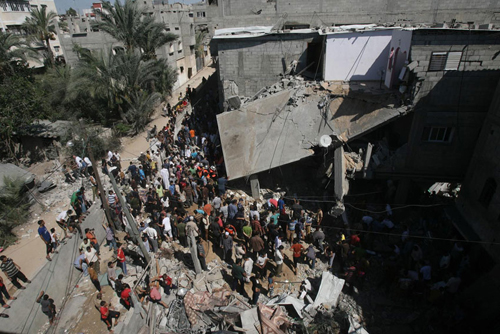 A large crowd gathers in front of a home that was destroyed during Israeli air strikes in the city of Khan Yunis in the southern Gaza Strip (8 July 2014). Repeated air strikes have destroyed many homes during the recent escalation of violence. Photo: UNICEF/NYHQ2014-0899/El Baba