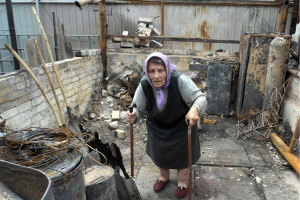 A resident of the Artema suburb of Sloviansk, Ukraine, in the rubble of what used to be her summer kitchen, in July 2014. Photo: UNHCR/Iva Zimova