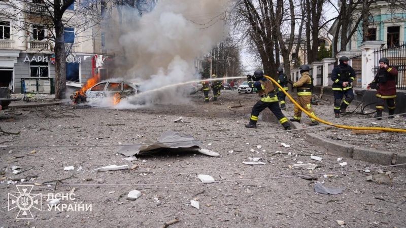 Firefighter trying to douse the flame following ballistic missile strike on Ukraine's Sumy. Photo Courtesy: Volodymyr Zelenskyy X handle
