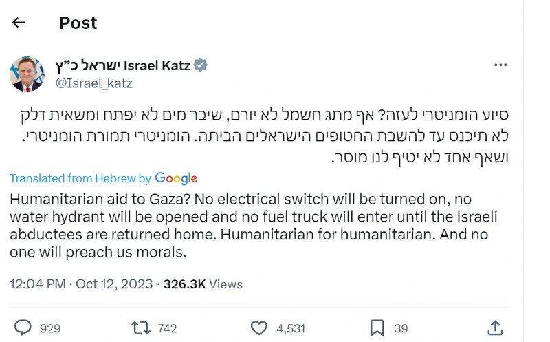 Won't allow water, fuel, humanitarian aid to Gaza till Hamas releases abducted people: Israeli Energy Minister Israel Katz