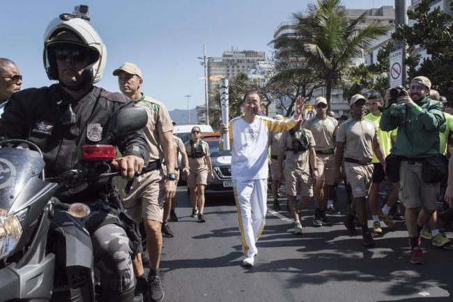 New York, Aug 6 (Just Earth News): United Nations Secretary-General Ban Ki-moon participated in the Olympic Torch Relay in Rio de Janeiro this morning as the historic torch, after having made its journey from Greece, is just hours away from lighting the Olympic Flame.