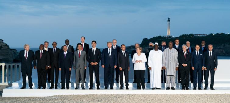 The G7 group of nations with partners at the Hotel du Palais Biarritz, the location of the G7 Summit in Biarritz, France. (25 August 2019)