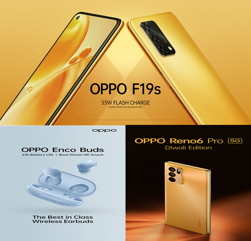The product line-up includes the all-new OPPO Reno6 Pro 5G Gold Diwali edition which is priced at INR 41,990 the F19s, priced at INR 19,990 and the Enco Buds in a new blue color variant, priced at INR 1,999.