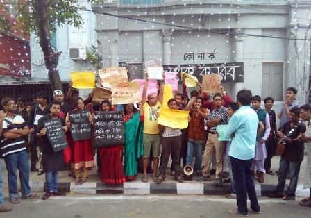 Students with posters and banners hollering the slogan "Hokkolorob" (the social networking page meaning Let There Be Noise that sparked off the students' movement) gathered in South Kolkata's Maddox Square puja pandal- known for its classy environment often- on Thursday afternoon to protest against the recent police crackdown on agitating Jadavpur University (JU) students.