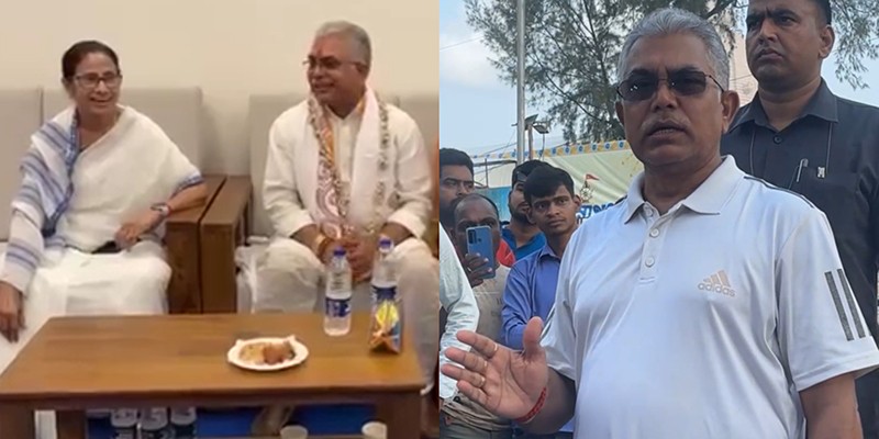 Dilip Ghosh interacting with Chief Minister Mamata Banerjee at Digha on Wednesday (L). Photo courtesy: Screen-grab