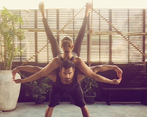 In the new pictures posted by Bipasha on her Twitter page, the actors are seen performing yoga asanas together.