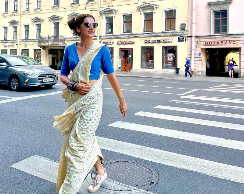 In a recent picture which she posted online, Pannu, who is now in Russia, is seen crossing the lanes of Saint Petersburg in a saree, a blue blouse, a pair of sneakers and dark glasses.