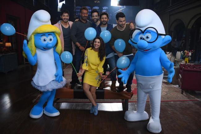 The cast and crew of Golmaal Again, i.e Ajay Devgn, Director Rohit Shetty, Parineeti Chopra, Arshad Warsi, Kunal Khemmu and Tusshar Kapoor were pleasantly surprised and extremely excited to meet the most loved characters- Brainy Smurf and Smurfette. It was a sight to see everyone laugh and enjoy with the characters.