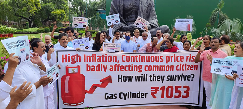 MPs carried placards, and raised slogans against hike in cooking gas prices and inflation in prices of essential commodities.