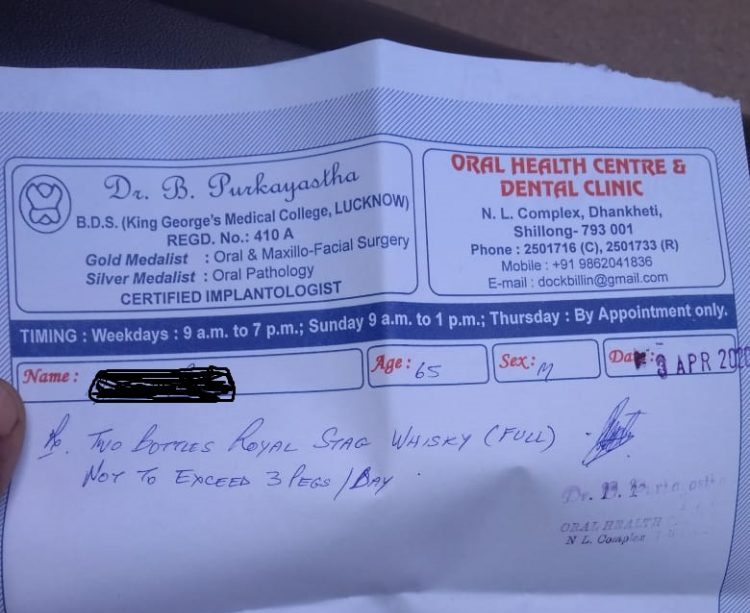 Guwahati/IBNS: At a time when the nation is witnessing a lockdown to combat against COVID-19, a Shillong based dentist prescribed whiskey to one of his patients who had complained of withdrawal symptoms.