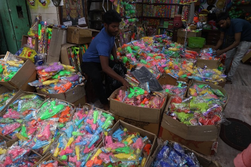 Holi is celebrated with much fervour in India and the preparations for this year's festival have begun. A worker is seen preparing colored powder known as Gulal while a local vendor, selling plastic water toys, awaits customers at a wholesale market in Kolkata on March 5, 2025. (Photos by Rupak De Chowdhuri)