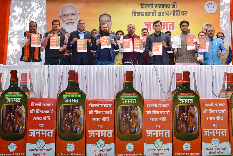 NEW DELHI, FEB 28 (UNI):- Delhi BJP President Adesh Gupta and BJP Lok Sabha MP Hans Raj Hans addressing a press conference against Delhi Government's 'New Liquor Policy' in New Delhi on Monday.