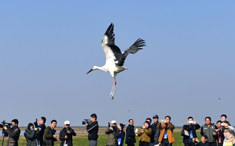 Nanchang, Dec. 9, 2019 (Xinhua) -- A white stork is released into the wild by staff members at the Poyang Lake National Nature Reserve in east Chinas Jiangxi Province, Dec. 8, 2019. A total of 120 cured migrant birds were released into the wild in Jiangxi on Sunday.