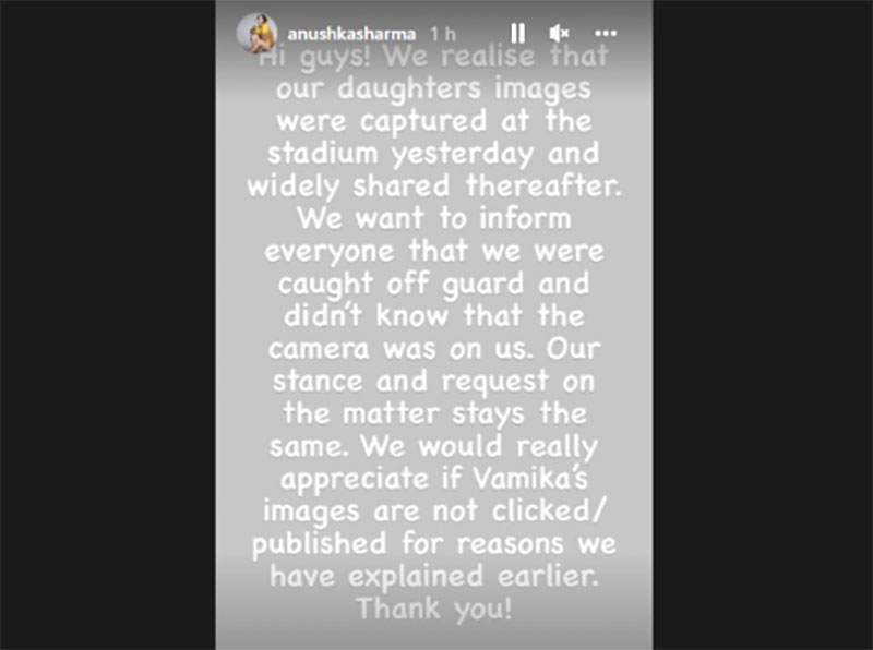 "Our stance and request on the matter stays the same. We would really appreciate (it) if Vamika's images are not clicked/published for reasons we have explained earlier. Thank you!"