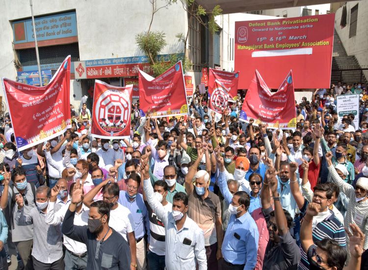 Nearly 40,000 bank employees in Bihar went on strike and demonstrated outside their banks against the centre's privatisation proposal.