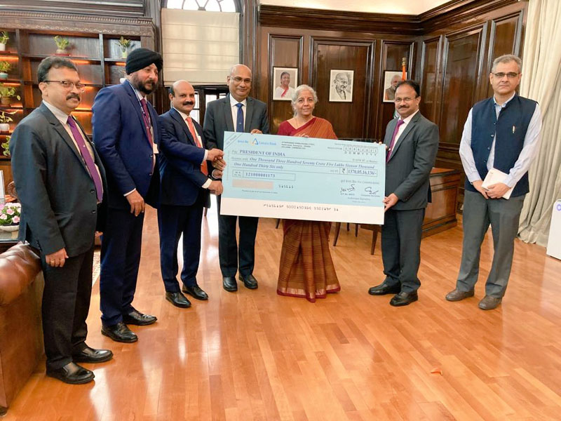 Kolkata: Canara Bank MD&CEO Satyanarayana Raju handed over a dividend cheque of Rs.1370 Croreto Union Finance Minister Nirmala Sitharaman.