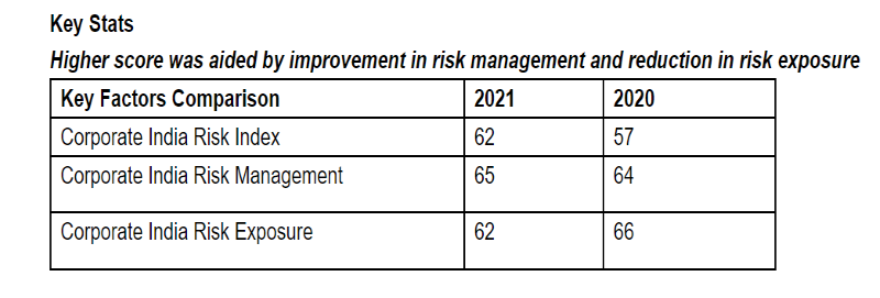 The Corporate India Risk Index 2021 score has gone up to 62 from 57 in 2020, representing "optimized risk handling" with scope for further improvement.