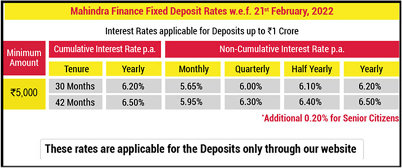 Vivek Karve, Chief Financial Officer, Mahindra Finance said: “The launch of this special deposit schemes is in accordance with our larger vision of offering multiple financial/ investment instruments through digital mode. Mahindra Finance’s fixed deposit schemes are FAAA rated by CRISIL, the credit rating that indicates Highest Safety”.