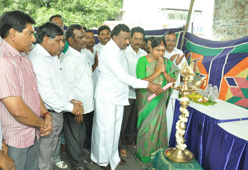 Chennai Mayor Saidai Duraiswamy lighting the ceremonial lamp at the function held to mark the commencement of the flyover cladding project at Chennai. On his left is state Minister for Social Welfare Valarmathi