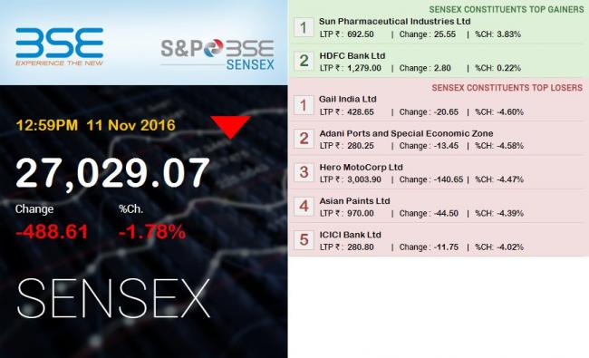 Mumbai, Nov 11 (IBNS): The Sensex on Friday has been on a downward spiral, down 489.94 points at 27,024.74 around one pm, according to media reports.