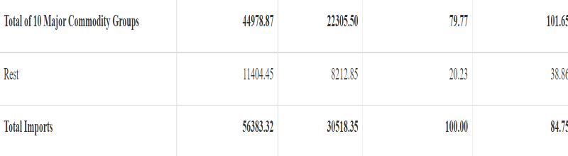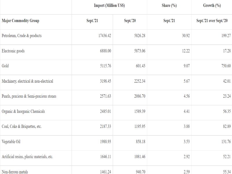 India’s merchandise imports in April-September 2021 was $ 275.92 billion, an increase of 82.36 percent over $151.31 billion in April-September 2020 and an increase of 11.22 percent over $ 248.08 billion in April-September 2019.