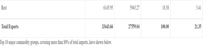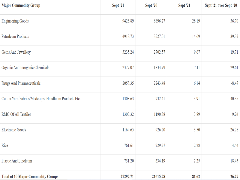 Top 10 major commodity groups, covering more than 80% of total exports, have shown positive growth in September 2021 over corresponding month of previous year, as stated below.