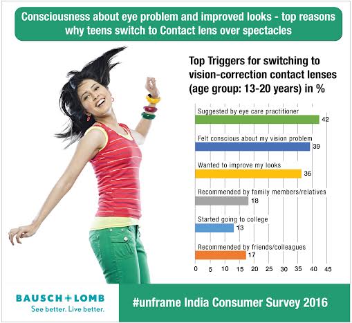 Even as ‘Recommendation from the eye practitioner (physical factor) turned out to be the biggest trigger (at 42%) for the youth, social factors emerged as a close number two trigger for adoption of contact lenses with as many as 39% citing that they felt conscious about their vision problem and 36% quoting that they wanted to transform their look by switching to lenses.