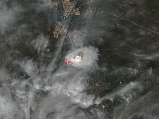 The image shows the area almost completely obliterated by the clouds of smoke rising from the fire.  The smoke released by any type of fire (forest, brush, crop, structure, tires, waste or wood burning) is a mixture of particles and chemicals produced by incomplete burning of carbon-containing materials. All smoke contains carbon monoxide, carbon dioxide and particulate matter (PM or soot). Smoke can contain many different chemicals, including aldehydes, acid gases, sulfur dioxide, nitrogen oxides, polycyclic aromatic hydrocarbons (PAHs), benzene, toluene, styrene, metals and dioxins.