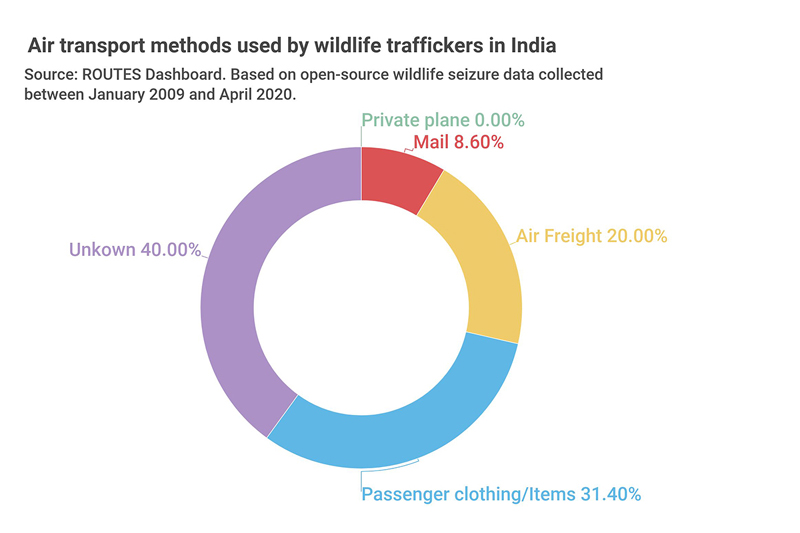 “Flyers smuggle live animals via check-in baggage, hand baggage or air cargo,” M. Maranko, Regional Deputy Director of the Wildlife Crime Control Bureau (WCCB) Western Region says. Over 31% of trafficked items were in checked luggage in India (43% globally) followed by air cargo at 20%, ROUTES data show.