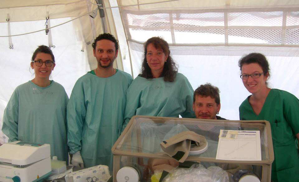 (Experts from the European Union Mobile Laboratory (EMLab) ready to support Ebola samples testings in Guéckédou, Guinea. Photo: WHO/S. Hugonnet)