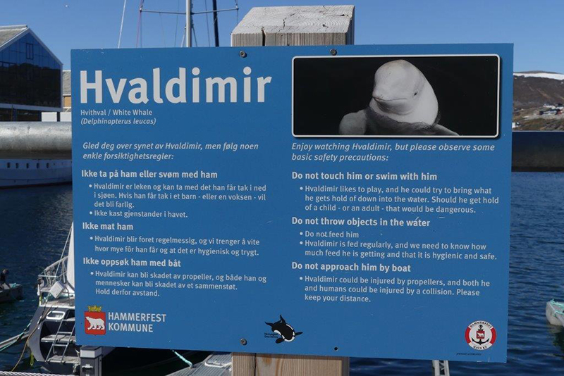 Sign at Hammerfest Harbour in Norwegian and English warning against interfering with Hvaldimir. Photo courtesy: DiFronzo / Wikipedia Creative Commons