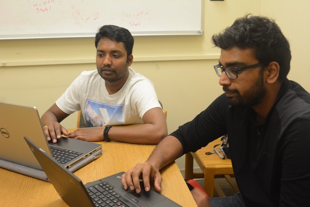 Sai Kumar Kovouri (left) and Rajesh Raghavan Balajiveeraragavan are discussing about their assignments in a study room in the University of Missouri, Columbia, Mo on Wednesday, April 19, 2017. Most of their work are finished on laptops.
