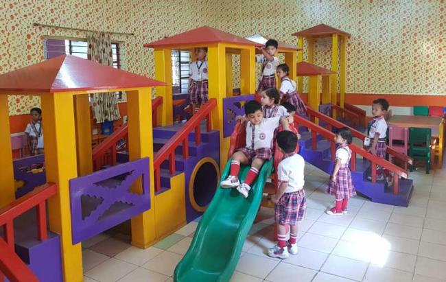The pre-primary section or The Kids World has an innovative playschool for children between 2 to 4 years where classrooms are marked in different colours which the tender minds can immediately register. The themes in these classrooms are changed frequently and aimed at developing cognitive skills, arouse curiosity, inculcate good habits, discipline, team spirit, interactivity and the flair to ask questions.