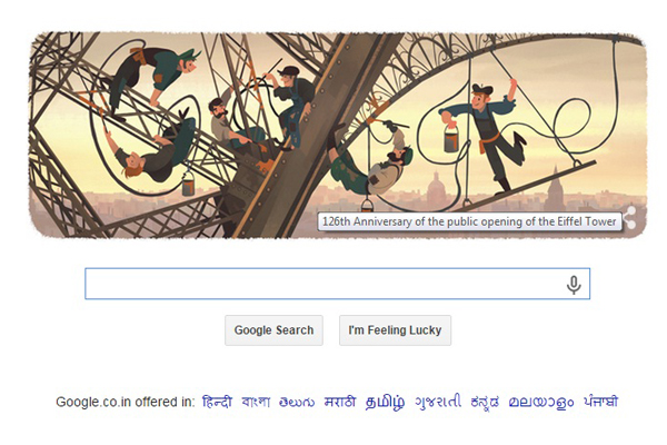 New York, Mar 31 (IBNS): Popular search engine Google on Tuesday celebrated the 126th anniversary of the opening of Paris' engineering wonder the Eiffel Tower by decorating their homepage with a colourful doodle.