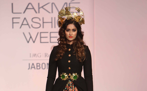 The glamorous B-town actress Ileana D’Cruz graced the ramp in a floor length black bandgala jacket styled with a stone encrusted belt, paired with a floral skirt and an elaborate gold head piece.