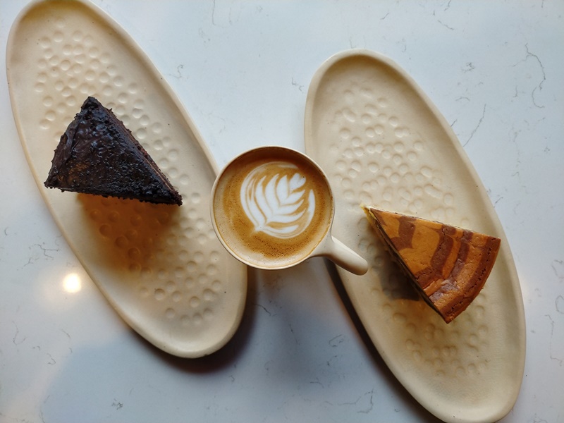 Food L-R Gluten-free chocolate cake, Latte, Marble Cheese cake | Image Credit: Ayush Gupta
