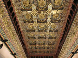 Mudejar art of decoration lays special emphasis on the techo artesonado, or ornately decorated coffered wooden ceiling. The spaces within the beams were covered with wood carvings, using geometric designs and plant motifs, or calligraphy. One of the finest examples, experts say, is this palace in Seville.