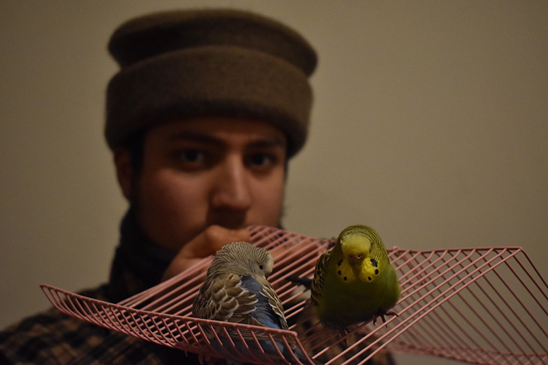 Suhaar holds a pair of Australian budgies on Jan. 17, 2022, in Kashmir, India. (Photo by Amir Bin Rafi)
