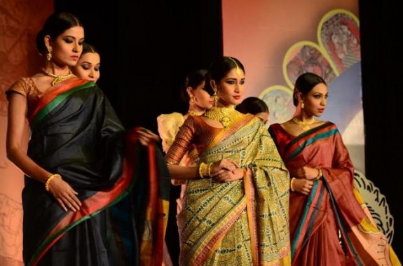 Madhubani collection- Madhubani, the famous art form based out of Madhuban, Bihar and the paintings on the sarees conveyed the stories of Radha Krishna.Models conveyed the traditional looks of Bengal along with the Madhubani jewellery collection.