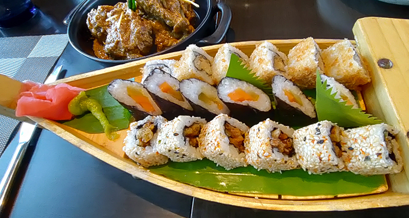 From the Asian section, we had a platter of futomaki sushi, yasai uramaki, and fish tempura uramaki, all excellent. I had a head-exploding moment as I made the mistake of putting a little too much of the wasabi sauce into my mouth — that was something to laugh about later, but just not quite at that moment.