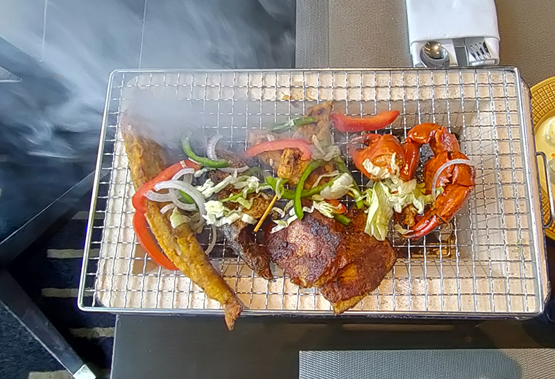We start with some chicken satay, assorted grilled vegetables, and bhutte matar ki shammi (veg kebabs), accompanied by some great tea and coffee. I started the meal with coffee rather than end with it — just a personal preference — and the blended coffee was outstanding. Served with some chilled lemon water and chilled basil water to cleanse the palate, the coffee brought pure happiness.