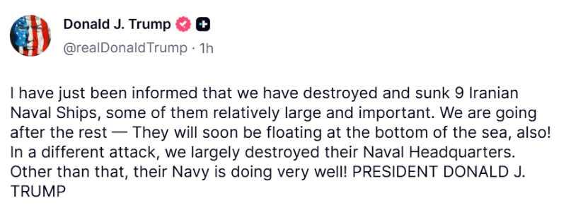Posting on his Truth Social platform, Trump wrote: “I have just been informed that we have destroyed and sunk 9 Iranian Naval Ships, some of them relatively large and important.”