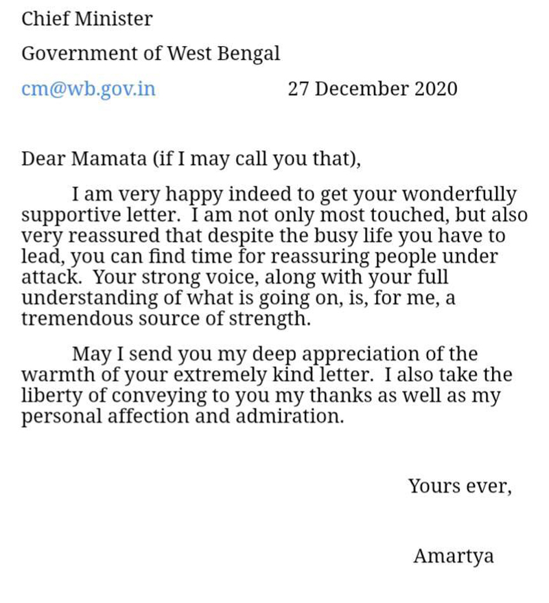 Responding to Mamata Banerjee's supportive letter, Amartya Sen on Sunday sent an email to the Bengal CM where he wrote, "I am very happy indeed to get your wonderfully supportive letter. I am not only most touched, but also very reassured that despite the busy life you have to lead, you can find time for reassuring people under attack."